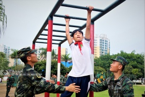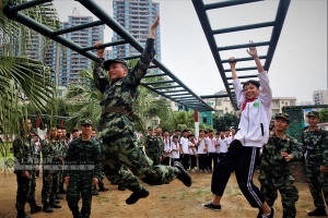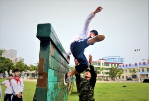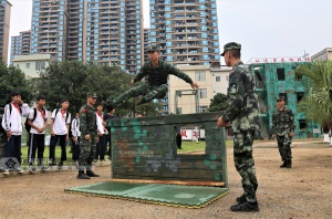 一名学生在武警官兵的保护下体验通过云梯。广西新闻网通讯员 余海洋 摄