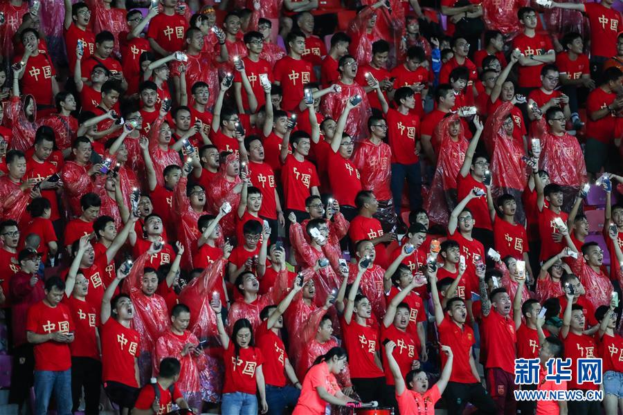 6月11日,中国队球迷为球队助威。 当日,在广州天河体育场举行的中国之队国际足球热身赛中,中国队以1比0战胜塔吉克斯坦队。 新华社记者刘大伟摄