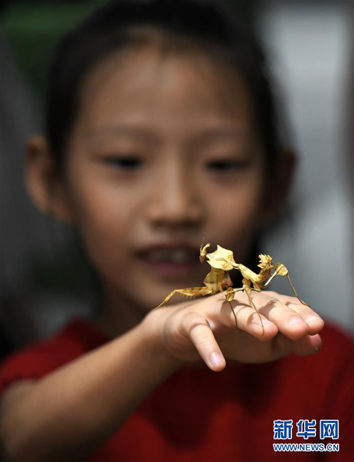 7月14日,一名小朋友在昆虫科普教育展上与一只螳螂“亲密接触”。 近日,一场别开生面的昆虫科普教育展在西安当代美术馆举行,七百余件昆虫标本和一百余种活体昆虫吸引了大批小朋友前来参观,丰富了广大青少年的暑假生活。 新华社记者 李一博 摄
