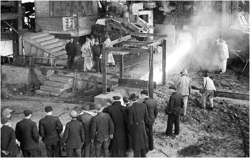 1953年3月11日,我国第一座自动化的炼铁炉——鞍山钢铁公司第8号炼铁炉开始出铁了。铁水经过化验,质量很好。这是开始出铁时,冶金部门的领导同志、苏联专家等正在参观的情形。
