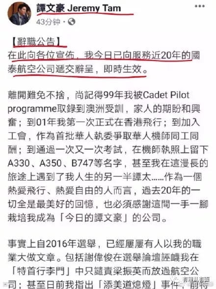 网上随后传出消息,指该名飞行员已被解雇。注意,是被解雇。 国泰航空发言人20日直言回应,“该机师不再是公司员工”,但并未说明他是自己辞职还是被解雇。 也许国泰航空,想给这位议员留下最后的遮羞布。但是,谭文豪为了挽回那点可怜的自尊,临走前还不忘加戏。 21日,其在Facebook上贴出辞职公告,称自己已向国泰航空公司辞职,实时生效。并附上了电影对白般的台词,声称因为不忍看到公司被攻击和“施压”,所以他决定辞职。还称希望可以以此“保护”国泰,“让航空界的风暴到我这里停止”,谭文豪随后更大放厥词,称自己会继续“守护自由”。