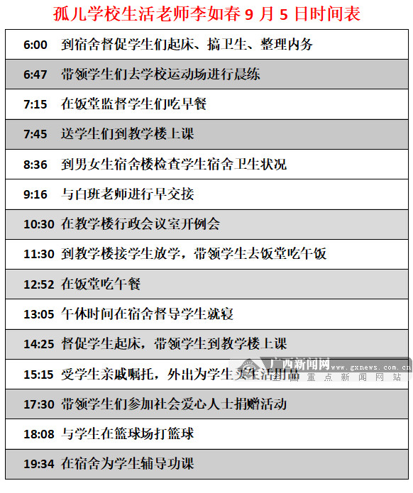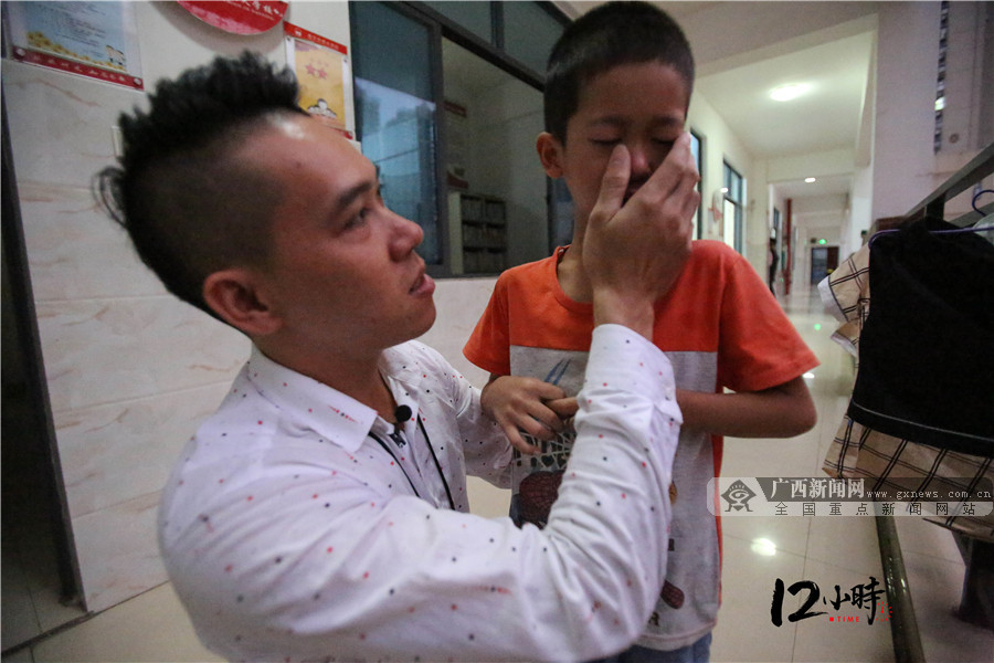 【12小时】167名孤儿一个”爹” 90后小伙辞掉高薪工作回母校当生活老师 广西新闻网记者 廖志荣 图/文 摄像、视频后期:何淞荧 每逢教师节,总有一种莫名的感动穿透我们日渐坚硬的内心。是那些平凡的教师让我们明白,为何平凡的背影日渐伟岸。师者,传道授业解惑也;甘守三尺讲台,教书育人……这是大多数人对老师的印象。然而,在学校里还有一群特别的老师——生活老师,他们同样是辛勤的“园丁”,更是学生们的“第二父母”,却很少被世人提及。 在第35个教师节来临之际, 广西新闻网【12小时】栏目组走进广西第一所孤儿学校——南宁明天学校,用手中的镜头记录下生活老师李如春的一天,向大家真实展现基层生活老师的工作和生活。 6:00 清晨,叫醒你的是什么?鸡鸣,闹钟还是梦想?在南宁明天学校,叫醒你的不是这些,而是生活老师。早上6时,天刚蒙蒙亮,我们本期【12小时】教师节特刊的主人公李如春早早地就来到宿舍督促学生们起床、搞卫生、整理内务。 “快醒醒,你看其他同学都起床整理好内务了!赶紧起来!”李如春挨间在宿舍中穿梭,叫醒那些还在赖床的学生。当他走向另一间宿舍的时候,发现一名孤儿手抓栏杆在默默哭泣。这一幕让李如春看在眼里急在心上。他脸色一变,连忙加快步伐迅速向前询问情况。用手轻轻擦拭这名学生的眼泪,细心安抚之后,这名学生才张开小嘴巴开始说话。这时候,李如春才得知,原来这位新生不适应学校的新环境,他想家、想爸爸妈妈了。 “我们学校是广西第一所以关爱孤儿为主旨,收养孤儿融入社区居民儿童共同教育成长的公办学校。”李如春向记者介绍,该校于2000年8月28日正式开学。经过十九年的发展,学校现有教职工181名,74个教学班,66个小学班,8个初中班,学生4035人,其中小学3635人,初中400人。学校先后招收来自南宁市各县区及百色河池革命老区的孤儿564名,在读小学、初中、高中乃至大学的有249人,目前已有315名孤儿学生完成高中、职高、乃至大学的学业,走上工作岗位,他们有的参军,有的成为教育工作者,有的成为医务工作者,他们从业广泛,在各自工作岗位上用自己的双手回报各级党委政府和社会各界爱心人士。 李如春告诉记者,加上本学期9月份新招的孤儿,目前学校里有167名孤儿,而整所学校就只有8名生活老师。而他是学校里唯一的一名男性生活老师。“167名学生一个‘爹’”,李如春对记者打趣道,在学校他就是这些孤儿们唯一的父亲。他说,做生活老师不仅辛苦而且要应对各种琐碎的事,但每天有那么多的“儿女”陪伴让他幸福感倍增。