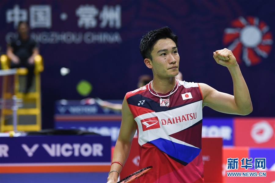 9月17日,桃田贤斗庆祝胜利。 当日,在江苏常州举行的2019中国羽毛球公开赛男单首轮比赛中,中国选手林丹以0比2不敌日本选手桃田贤斗。 新华社记者李博摄