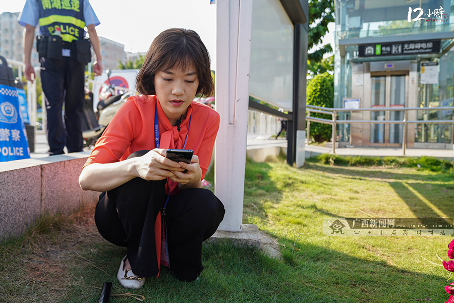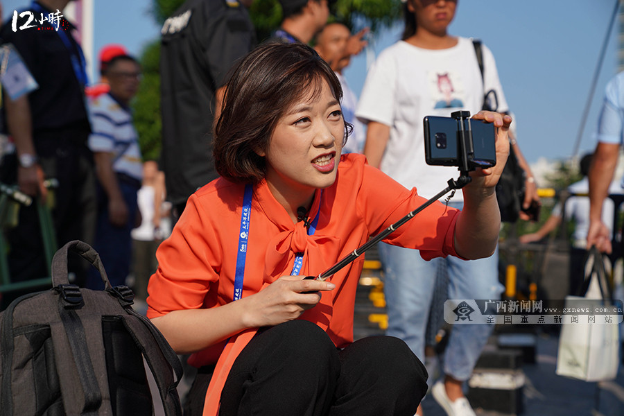 8:05 记者陈海霞在南宁国际会展中心外围出镜。 陈海霞是广西新闻网首席主播,作为出镜主播,她在东博会第一天的首个任务,就是拍摄下自己参与东博会报道的“vlog”。虽然已知道中午12时后才能进入会场内,但她也早早地来到现场,记录下会场外发生的点点滴滴。 8:10 陈海霞在南宁国际会展中心外围对在场外等候的志愿者、参展商、专业观众等进行采访。 8:20 处理照片,编发快讯。陈海霞介绍,除了拍出镜,她还需要拍摄图片,发回给后方编辑,让编辑第一时间发布东博会最新资讯,或者进行图文、帖文直播。 待12时可以通过安检进入南宁国际会展中心后,陈海霞将开始用手机直播。当天她与另一位实习主播需要直播B2展厅的国际经济与产能合作展、先进技术展等。她告诉记者,每年的东博会对于她和同事来说,都是一场结结实实的“硬仗”。打一场,最少需要一个月来恢复元气。但是,看到东博会一年比一年热闹,一年比一年成功,她就觉得很骄傲、很自豪,“再累都值得!”