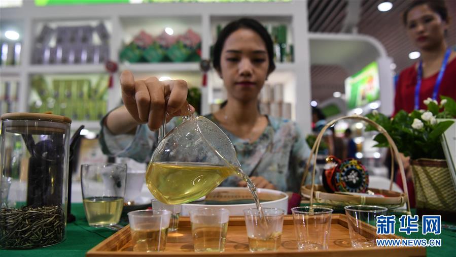 9月22日,在第16届中国-东盟博览会农业展上,来自南宁市横县的一名茶艺师在现场推销茉莉花产品。 当日,第16届中国—东盟博览会农业展在广西南宁举行,展销的渔牧产品、优质水果、茶叶等特色农产品和东盟特色食品吸引了众多参观者前来“赶集采购”。 新华社记者 张爱林 摄
