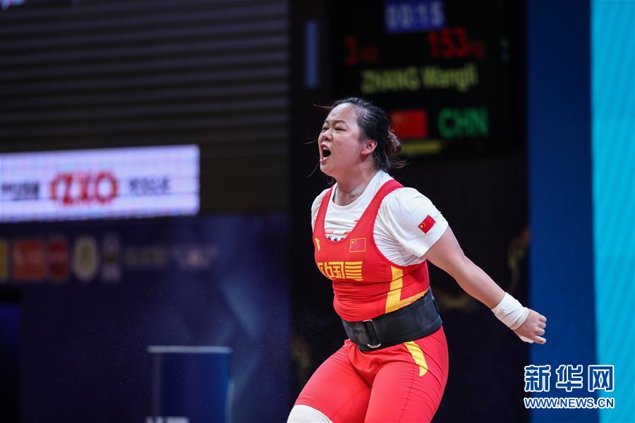 9月24日,中国选手张旺丽在挺举比赛中。 当日,在泰国芭提雅举行的2019世界举重锦标赛女子76公斤级比赛中,中国选手张旺丽以153公斤获得挺举冠军,总成绩271公斤获得亚军。 新华社记者 张可任 摄