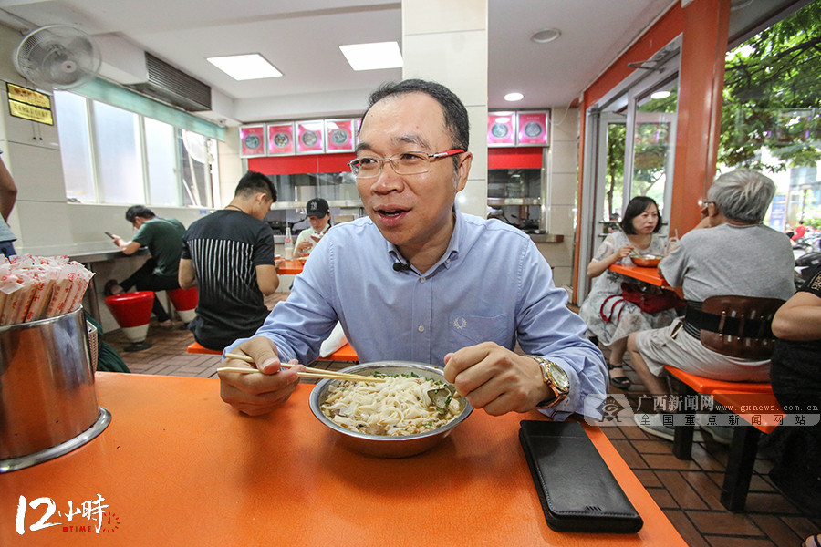 8:10 游泳晨练结束后,潘家穰辗转来到南宁七星路一家老友粉店吃早餐。 “在南宁,美好的一天都从一碗老友粉开始!”潘家穰告诉记者,在南宁他最青睐的本地美食是老友粉。在肚子很饿的情况下他一般都会吃上3两。为了吃上一碗垂涎欲滴的老友粉,潘家穰已经记不清自己错过了多少次航班。 “十几年来我觉得南宁的发展越来越多元化,基本上三年一大变!”在南宁工作生活了14年,潘家穰对南宁的发展变化十分赞叹。潘家穰称,目前南宁生活环境不比香港差,购物、逛街、吃饭可以去航洋国际、万象城、三祺广场等地方。此外,这里不仅交通方便,绿树如茵,各种配套设施一应俱全…… 潘家穰刚来广西创业时,从香港到广西要花十几个小时。今年7月10日,南宁到香港的动车开通,如今香港到南宁不到四个小时。潘家穰称,随着两地交流的空间距离、人心距离不断拉近,这将对两地的融合发展带来更大便利。他希望能有更多的港澳青年来这里创业,给广西增加一些国际视野。