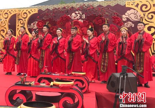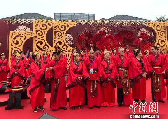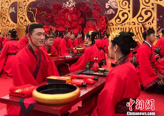 当日下午,现场的70对新人和70对老年夫妻都身着汉服相聚在运河三湾风景区,现场热闹非凡,让整个运河三湾风景区洋溢了满满的喜气。婚礼按照汉式婚礼的流程与环节,新人们跨火盆、过马鞍、集体拜堂,挑起红盖头……再现古代婚俗传统的场景,驻足围观的民众集体为新人们送上了祝福。