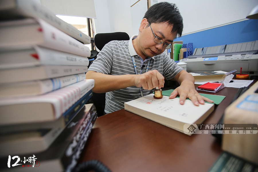 13:36 吃完午饭后,顾不上午休的陈裕川又马不停蹄地投入到工作中。他将征集到的赠书录入图书馆系统,在进行查重之后将没有重复的书籍盖上印章送往图书馆采编中心。