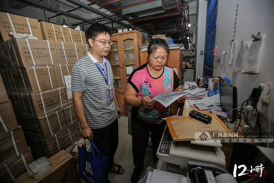 14:36 刚忙完前一项工作不久,陈裕川又准备外出。下午,他需要前往广西美术出版社书库进行现场征集。此外,陈裕川还需前往邕州南岸公园办公区某捐赠者家归还前不久展览所借的老物件。 14时36,陈裕川来到广西美术出版社书库,在书库里,陈裕川与书库工作人员按照清单在书库里找寻与之对应的书。偌大的书库要找全清单上的几十本书如同大海捞针,陈裕川一折腾就是个把小时,汗水浸湿了衬衫。