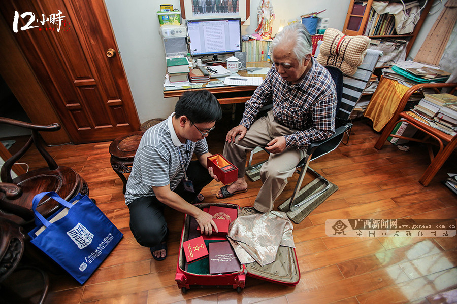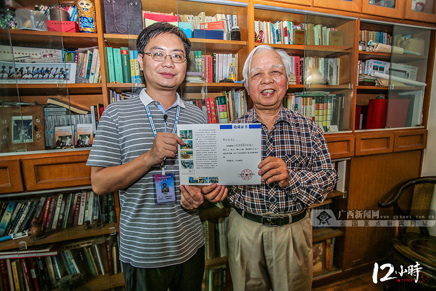 16:32 陈裕川来到邕州南岸公园办公区某捐赠者家归还展览老物件。这位头发花白的捐赠者是位老作家,撰写了10余本有关援越抗美的书籍,陈裕川此行的目的不仅是归还参展老物件那么简单,他还想跟这位捐赠者进行二次征集。在成功地征集到又一册书籍后,陈裕川给捐赠者送上收藏证书,脸上露出灿烂的笑容。