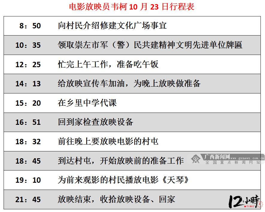 【12小时】38年26万多公里万余场,放映员韦柯用光影点亮乡村夜晚 广西新闻网记者 王飞 文/图 摄像:林亮 漫天繁星下,田野乡间,幕布前一片温馨:大人们全神贯注地看着银幕,随着故事展开,或是开怀大笑,或是神情紧张;贪玩的小孩子们在人群中你追我赶,嬉笑打闹;摇着蒲扇的老人们聊着烂熟于心的剧情……这些画面,是否曾在你的记忆里浮现过? 一部电影 ,一次震撼;一卷胶片,一段记忆。一位放映员,一台放映机,曾经带去几多欢喜,几多热闹。电影放映,曾是村民们重要的文化活动。随着时代的发展,如今,农村电影放映逐渐失去了往日的红火,但是依然有人坚守乡村,用光影照耀出一条农村文化传播之路。本期《12小时》就让我们认识这样一位放映员。10月23日,在崇左市宁明县峙浪乡,广西新闻网记者见到了电影放映员韦柯,跟随他的一天,聆听他的光影故事。 8:50 今年53岁的韦柯是崇左市宁明县峙浪乡的一位乡村公益电影放映员,从1981年成立电影队后跟着两位哥哥放映电影算起,他一干就是38年,如今早已成为十里八乡最“知名”的人物。 上世纪70、80年代,看露天电影是农村十分重要的文化娱乐活动。“看电影,就像过年一样热闹。”说起和电影的结缘,韦柯说,38年前的那次观影经历给他留下了深刻的印象。 38年前的一个夏日,村里人说爱店镇晚上要放电影,得知这一消息后,韦柯和哥哥们高兴得不得了。下午三时,家人就开始生火做饭。因为家里距爱店镇有十几公里山路,为了在电影开场前赶到,韦柯和哥哥们带上用香蕉叶包好的饭团早早出发,一路上也不敢多休息,只顾忙着赶路。 “我记得那部电影是《车轮滚滚》,是部战争片。看着银幕上流动的画面,激动得不得了!”银幕亮起时,全场瞬间安静下来,年少的韦柯那时还并不能完全看懂电影的情节,但是他却早已被眼前的一切所吸引。“电影结束,我和哥哥一路走回来,谈论的话题还是刚刚的电影。”韦柯说他们走了一路,聊了一路,回到村里差不多都快天亮了,兴奋得毫无睡意。 10月23日8时50分,韦柯和朋友从家来到村里河边一空地,和正在打理菜地的一位阿婆聊了起来。原来,这块土地要规划成供村民娱乐休闲的文化活动广场,正好要占用阿婆的菜地,有人让韦柯来做阿婆的思想工作。平时除了放电影,韦柯也会给大家放些科普片、新农村宣传片,加上长期在各地放电影,声望高,韦柯很快得到阿婆信任,大家也都支持文化广场的修建。