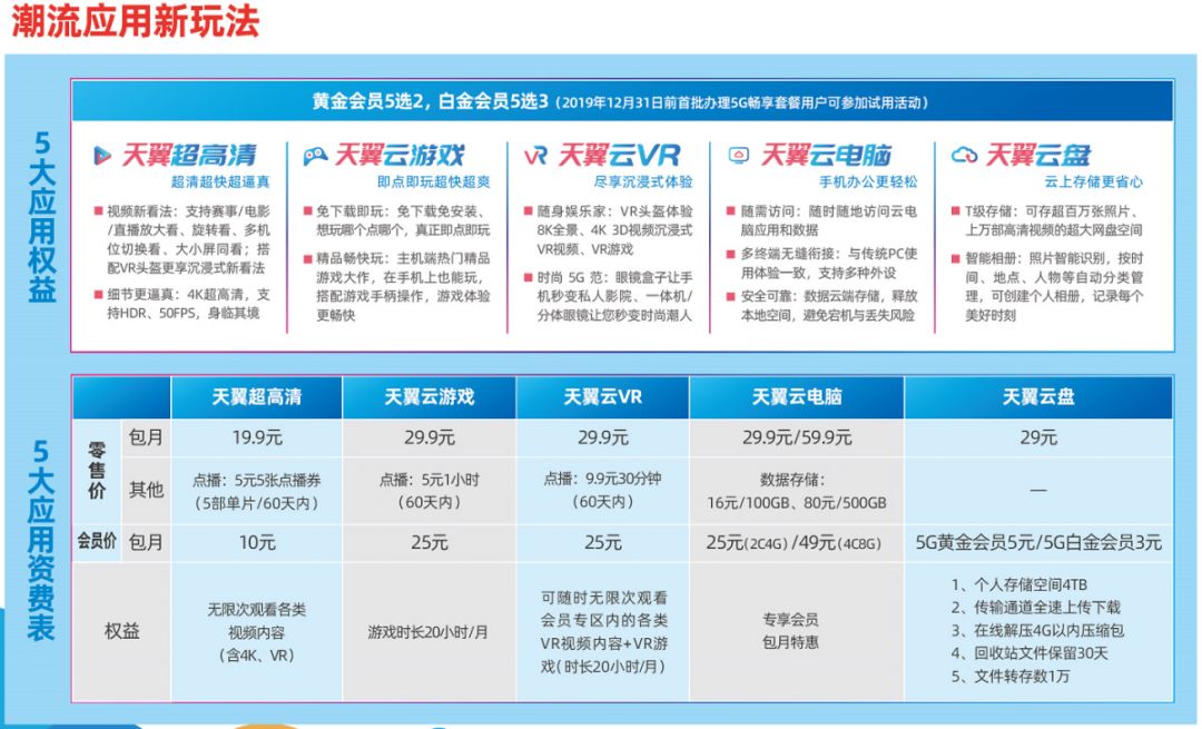 △移动5G套餐分为3种速率:5G基础服务(300Mbps)、5G优享服务(500Mbps)、5G极速服务(1Gbps)。个人版198元以下和家庭版269元以下为5G优享服务,个人版198元以上和家庭版269元以上为5G极速服务,而在信号弱的地区则为5G基础服务。 2 中国电信 中国电信的5G套餐有7个档次,最低档为129元每月(30GB)500分钟通话,最高档次为599元每月(300GB)3000分钟通话。