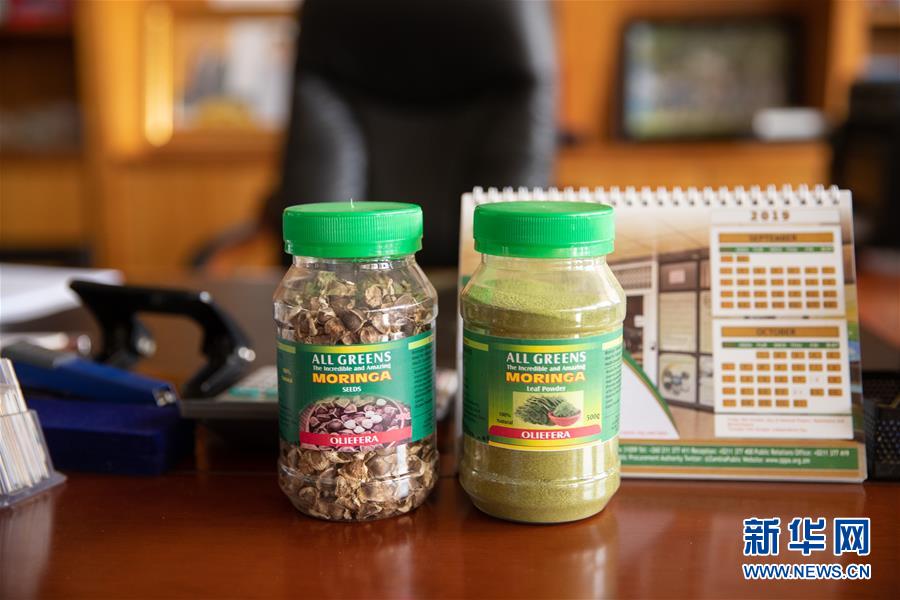 10月30日,赞比亚商贸工部长克里斯托弗·亚卢马在卢萨卡接受专访。这是亚卢马办公桌上的辣木籽和辣木叶子粉,将在进博会上参展。新华社记者彭立军摄 |