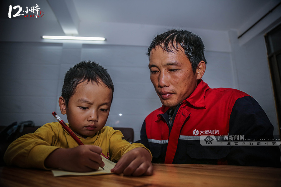 19:36 下班后,蓝富回到了位于南宁苏卢村的租房。饭后,他认真地辅导小儿子写作业。“知识改变命运!希望孩子将来能考上大学,有一份理想的工作。”蓝富意味深长地告诉记者,他文化程度低,只能靠劳力挣钱,但愿孩子长大了不要像他一样活得那么劳累。 记者手记: 城市的发展建设,既离不开设计师、工程师等专业大咖,也离不开普通农民工等基层人员。正是无数的劳动者用汗水灌溉,用劳动经营,用无私维护,换来了城市面貌的日新月异、社会的长治久安,让新时代的人们幸福感倍增。 “劳动者最光荣!”跟拍了蓝富一天的工作日,记者切身体会到,蓝富在自己岗位上的艰辛与不易。没有奖杯,没有证书,更没有花里胡哨的头衔……从业16年来,蓝富始终兢兢业业默默地坚守在自己的岗位上,秉持着入行的初心,默默地做出自己的贡献。