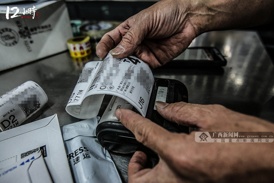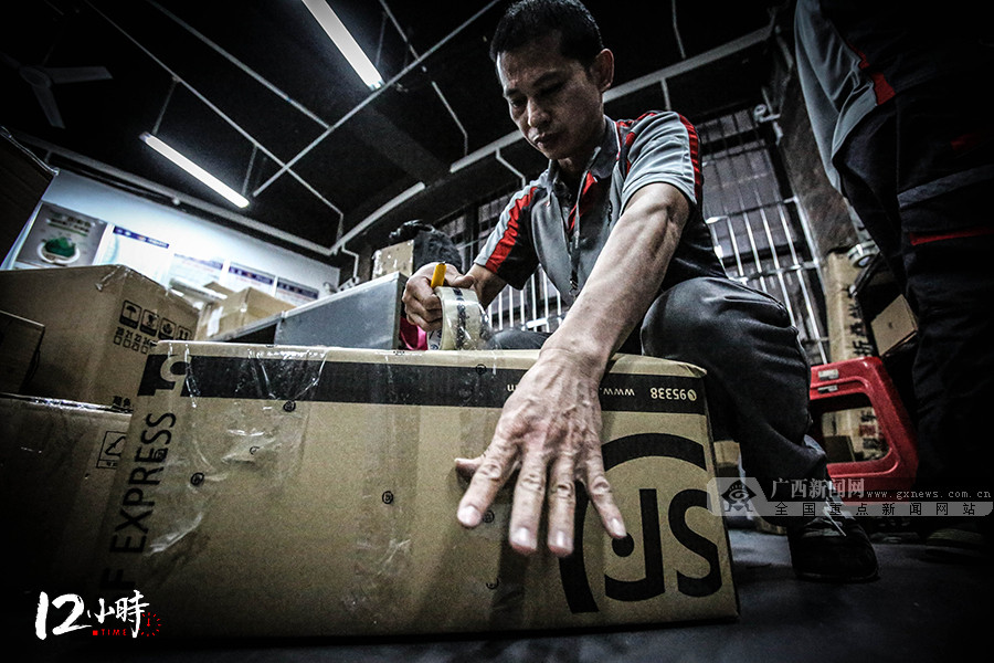 12:54 送完一车一百多件的快速黄明夫花了将近4个小时的时间。上午的派件结束后,黄明夫迅速返回快递营业点,将上午收到的快递件进行打包、贴单、装卸,完成交件工作。 “一忙起来经常顾不上吃饭”,黄明夫说,他每天清晨到营业点打卡后,就开始忙着从物流车上卸货、分拣、归类,随后装车、派件。对他这样的熟手而言,快递从到达营业点至送抵收件人手中,最快不会超过1个小时。他清晰地记得,今年“双11”期间,自己所派送的第一份快递,就是广西日报社大院内一名业主的一盒名牌化妆品,在11月11日当天清晨7:30左右送至收件人家中。