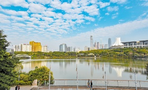 今天(11月22日)是小雪节气,南宁依然呈现出花红草绿、生机盎然的景致。随着冷空气削弱,连日来,南宁持续放晴,抬头可见醉人的“南宁蓝”;四顾是绿树环城、碧水泛波的怡人“生态绿”。图为民歌湖一带的冬日胜景。记者尹海明 潘浩摄(南宁日报)