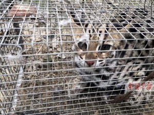11月20日中午,在河池市宜州区城中市场有人兜售豹猫、猫头鹰等保护动物。一市民担心这些保护动物被他人宰杀,便自掏腰包买下,送到河池市森林公安局庆远派出所,民警随后将其放生。图为等待放生的豹猫。河池市森林公安局庆远派出所供图(广西新闻网-南国早报)