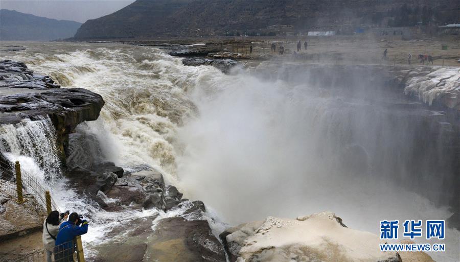 12月14日,游人在壶口瀑布景区拍照(无人机拍摄)。 位于秦晋大峡谷的黄河壶口瀑布,冬日水量较夏日虽然有所减少,但惊天动地的涛声依旧,周围石壁上的冰挂与河中的浪涛构成一幅独特的北国风光图,吸引游客前来观赏。 新华社记者 陶明 摄