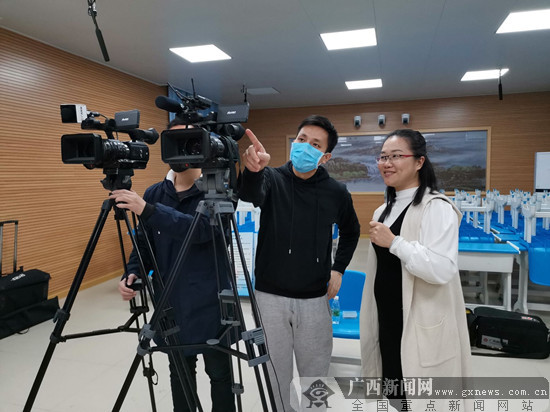 2月4日,广西新闻网的两位专业摄影记者及信息技术叶成舟老师早早来到录课教室做好设备调试。罗燕婷副校长、郭小瑜副校长和教导处陈玉玲主任到录播教室进行组织协调。