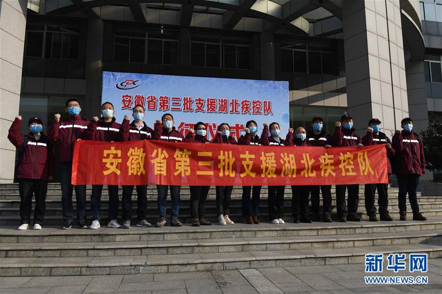 2月23日,在安徽合肥,安徽省第三批支援湖北疾控队的成员在出征仪式上。 当日,由14名公共卫生专业人员组成的安徽省第三批支援湖北疾控队从合肥出发前往湖北。 新华社记者 张端 摄