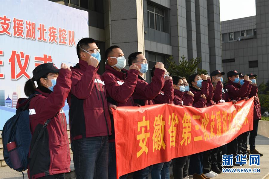 2月23日,在安徽合肥,安徽省第三批支援湖北疾控队的成员在出征仪式上。 当日,由14名公共卫生专业人员组成的安徽省第三批支援湖北疾控队从合肥出发前往湖北。 新华社记者 张端 摄
