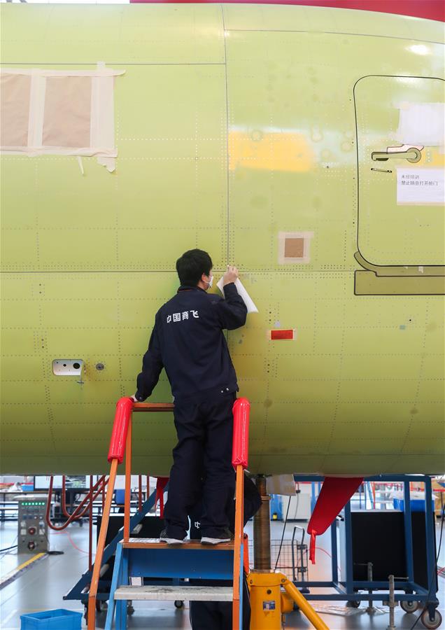 3月6日,工人在中国商飞上海飞机制造有限公司的生产车间内作业。 当日,记者探访了中国商飞上海飞机制造有限公司。中国商飞公司一手抓疫情防控,一手抓复工复产复飞,扎实推进型号研制与生产运营工作。 新华社记者 丁汀 摄