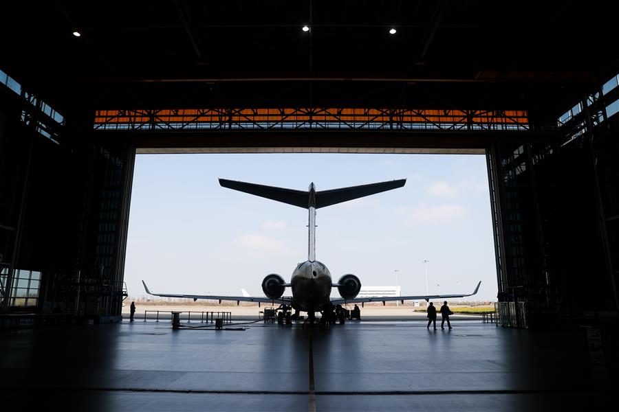 在中国商飞上海飞机制造有限公司生产车间内的ARJ21-700飞机(3月6日摄)。 当日,记者探访了中国商飞上海飞机制造有限公司。中国商飞公司一手抓疫情防控,一手抓复工复产复飞,扎实推进型号研制与生产运营工作。 新华社记者 丁汀 摄