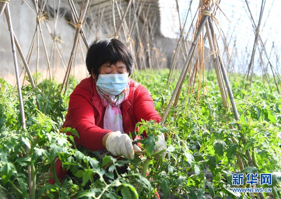 3月7日,在苏家坨镇北京周家巷农业发展有限公司农产品生产基地蔬菜种植大棚,工作人员在对西红柿苗进行绑蔓。新华社记者 任超 摄