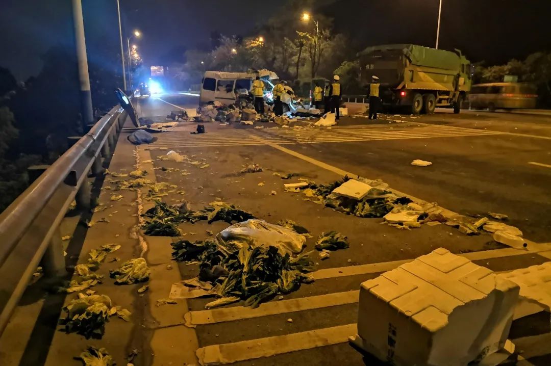 一辆白色面包车斜停在泥头车后,面包车的车头损毁严重,已看不出原貌。车身凹陷变形,两扇车门已被卸下放在路边,路旁的两具尸体上盖着蓝布。
