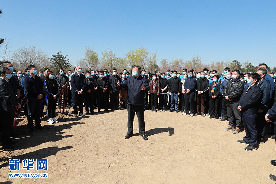 4月3日,党和国家领导人习近平、李克强、栗战书、汪洋、王沪宁、赵乐际、韩正、王岐山等来到北京市大兴区旧宫镇参加首都义务植树活动。这是植树期间,习近平同在场的干部群众亲切交谈。 新华社记者 庞兴雷 摄