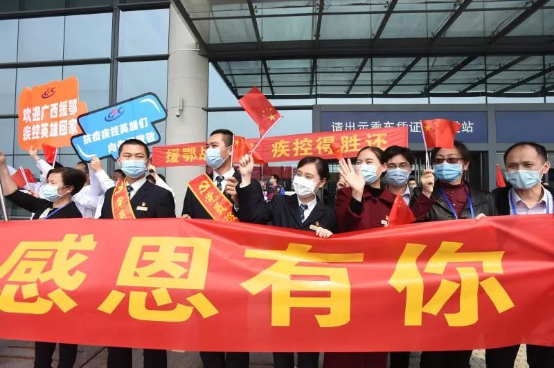 在武汉的46天里,队员们驻扎在武汉市东湖高新区开展防疫工作。按照前方指挥部“尽早对接、尽早开展工作、尽早进入最佳工作状态”的要求,发扬疾控人不怕苦不怕累的精神,同当地疾控人员同吃同住同干活,利用自己扎实的专业知识和丰富的现场流行病学经验,履职尽责当好战斗员、参谋员、情报员的职责。从源头上遏制新冠肺炎疫情的扩散蔓延,并圆满完成各项任务。 受自治区领导委托,自治区卫生健康委相关负责人到南宁东站迎接凯旋的疾控队员,向他们致以崇高敬意和亲切问候,欢迎他们回家。称赞他们在全国疫情最严峻时刻,为打赢湖北保卫战,积极响应习近平总书记、党中央国务院的号召挺身而出,代表广西全力驰援湖北省武汉市,他们逆行出征、舍身忘我,与疫情决战,用大爱践行疾控人“预防为主,守护健康”的初心和使命,展现了广西疾控队高超的技术水平和良好的医德风范,展现了壮乡儿女的使命担当,展现了中华民族“一方有难 八方支援”的优良传统和浓浓情义。湖北当前疫情防控取得了阶段性胜利,有队员们的付出和汗水,功不可没!此次战疫经历,必将成为队员们人生中一份难忘而宝贵的财富。