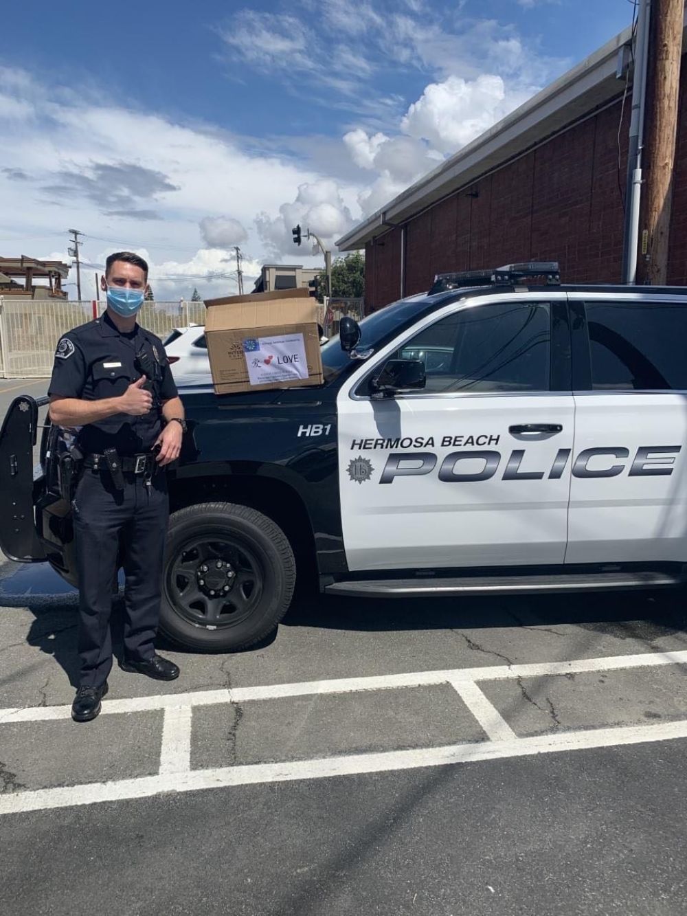 4月8日,在美国洛杉矶县赫莫萨比奇市,一名警察戴上华侨华人捐赠的口罩后留影。(新华社发,赫莫萨比奇市警察局供图) 马扎表示,华人社区是阿尔汉布拉市的重要组成部分,他们的善举体现了整个城市在抗疫过程中的团结与互助。