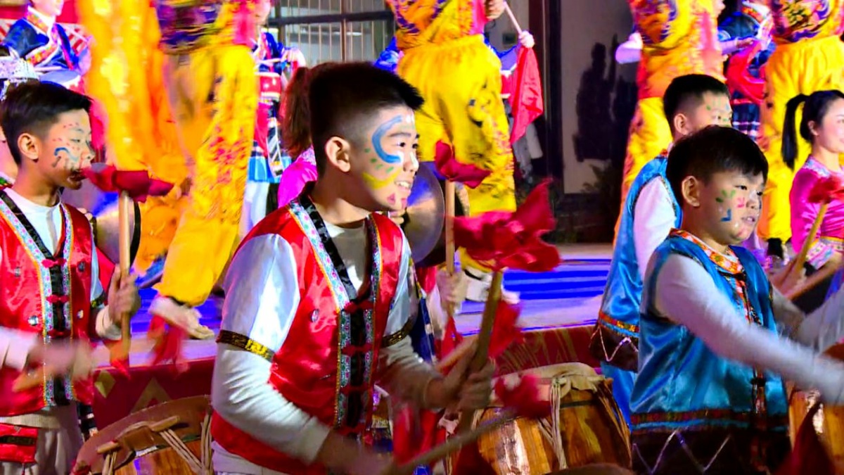 这是由明秀小学会鼓队和腾龙醒狮队带来的开场舞蹈,洪亮有力、节奏整齐的会鼓声直击人心。击打会鼓的学生们身着壮民族特色服装,喜笑颜开,小小的身体迸发出无穷的力量。鼓声时而平缓,时而急促,与腾龙、醒狮互相配合,形象地表达出龙狮的欢腾雀跃。