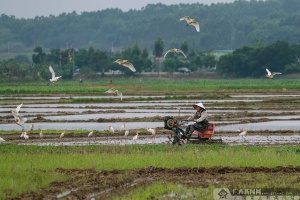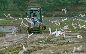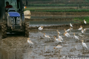 广西新闻网横县4月22日讯(通讯员 黄汝德)白鹭忽飞来,点破秧针绿。近日,在横县莲塘镇的田间地头,飞来了一群白鹭,为绿油油的田地添上了活气与亮色。正值春耕时期,当地村民在田间辛勤劳作吸引了成群结队的白鹭,它们飞舞追随着耕田机,在新翻耕的稻田里寻觅捕食,在“绿色地毯”里,人鸟和谐相处,构成了一幅秀丽的春日乡村、自然生态、田园农耕画卷。