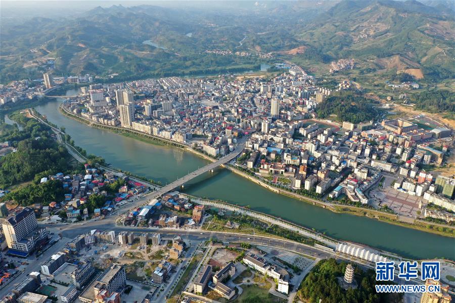 这是广西环江毛南族自治县县城风貌(5月14日摄,无人机照片)。 毛南族是我国28个人口较少民族之一,广西壮族自治区环江县是国家扶贫开发工作重点县,也是全国唯一的毛南族自治县,全县有毛南族6.45万人,占全国毛南族总人口的约70%。2019年底,环江县贫困发生率降至1.48%。2020年5月,环江县退出贫困县序列。综合全国毛南族脱贫情况,毛南族已实现整族脱贫。 新华社记者 陆波岸 摄