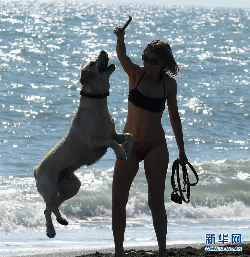5月24日,在意大利首都罗马附近的拉迪斯波利,一名女子与她的狗在海滩上玩耍。 意大利民事保护部24日发布的数据显示,该国现有新冠患者人数比前一天减少1158人,降至56594人;新增治愈病例1639例,累计治愈140479例。 新华社发