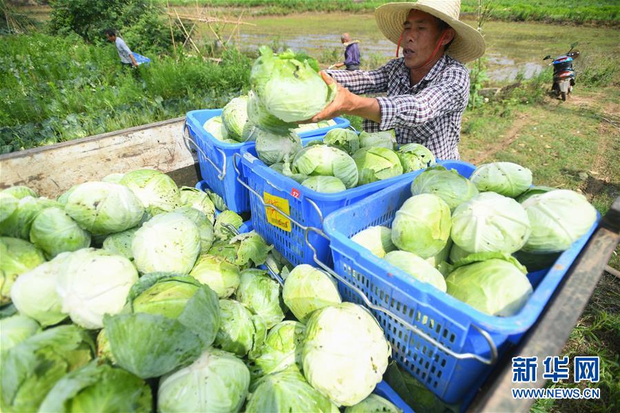 6月4日,在湘潭市雨湖区鹤岭镇龙安村,湘潭市仙女蔬菜产销专业合作社的农户将采摘的包菜装车。 近年来,湖南省湘潭市雨湖区着力推进蔬菜产业发展,按照“农业企业/合作社+农户”的蔬菜产业化模式经营,通过安排贫困户就业、收购农副产品、技术指导等方式,有力促进农民脱贫增收。目前,湘潭市雨湖区的蔬菜产业扶贫项目有7个,带动贫困户户均增收3000元以上,受益贫困户4487人。 新华社记者 陈泽国 摄