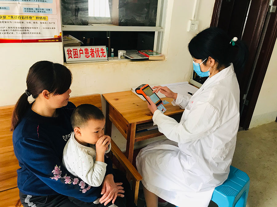 广西百色市乐业县百坭村群众通过“村医通”现场报销。