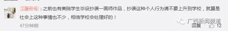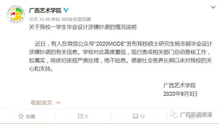今天(3日) 广西艺术学院官方微博发布情况说明 该校一位硕士研究生毕业设计涉嫌抄袭 现已责成相关部门启动查核工作 关于我校一学生毕业设计涉嫌抄袭的情况说明 近日,有人在微信公众号“2020MODE”发布我校硕士研究生杨志超毕业设计涉嫌抄袭的有关信息。学校对此高度重视,现已责成相关部门启动查核工作,如属实,将依纪依规严肃处理,绝不姑息。感谢社会各界长期以来对我校的关心和支持。 广西艺术学院 2020年8月3日 官方微博截图