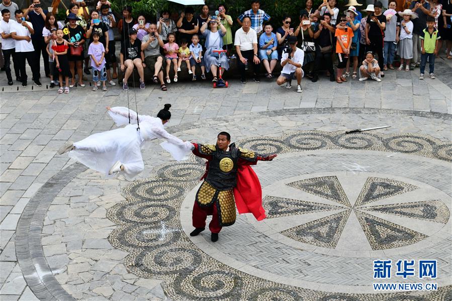 8月8日,游客在贵州省龙里县“龙门镇”武侠文化主题景区观看武侠剧表演。 近日,贵州省黔南布依族苗族自治州龙里县境内气候宜人,龙里油画大草原、“龙门镇”武侠文化主题景区等景点吸引众多游客前来观光旅游。 新华社记者 杨文斌 摄