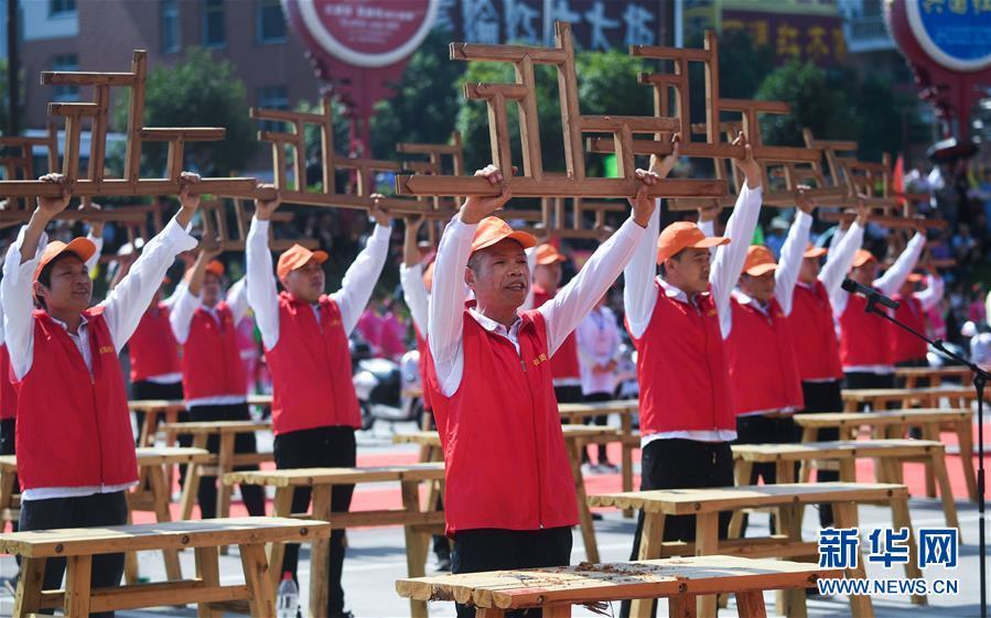 9月8日,千名红木产业工匠在展销会开幕式现场展示红木加工过程中的卯榫拼接、刮磨、雕刻等工艺,倡导工匠精神。新华社记者 徐昱 摄