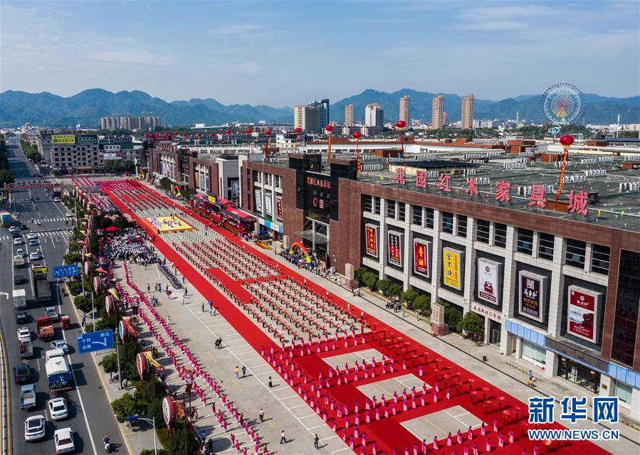 空中俯瞰红木展销会开幕式现场(9月8日摄,无人机照片)。 当日,被誉为“红木第一村”的浙江省东阳市南马镇花园村举办2020中国·花园红木家具展销会,数以万计来自全国各地的红木家具生产商、经销商以及消费者齐聚花园红木家具城,开启了金秋红木家具黄金采购季。 经过十多年创新发展,花园村现已形成原木市场、板材市场、红木配套中心、产业核心区块、红木长廊以及红木家具城等红木家具全产业链和产业群,拥有红木家具以及木制品行业经营户2550家。2019年,花园村实现经营收入602亿元,村民人均年收入达13.5万元。红木产业还辐射到周边六个乡镇街道,带动数以十万计的百姓走向小康。 新华社记者 徐昱 摄