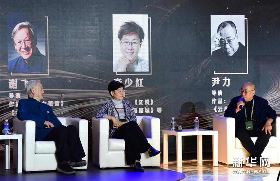 9月24日,导演谢飞、李少红和尹力(由左至右)在论坛上。 新华社记者 朱祥 摄