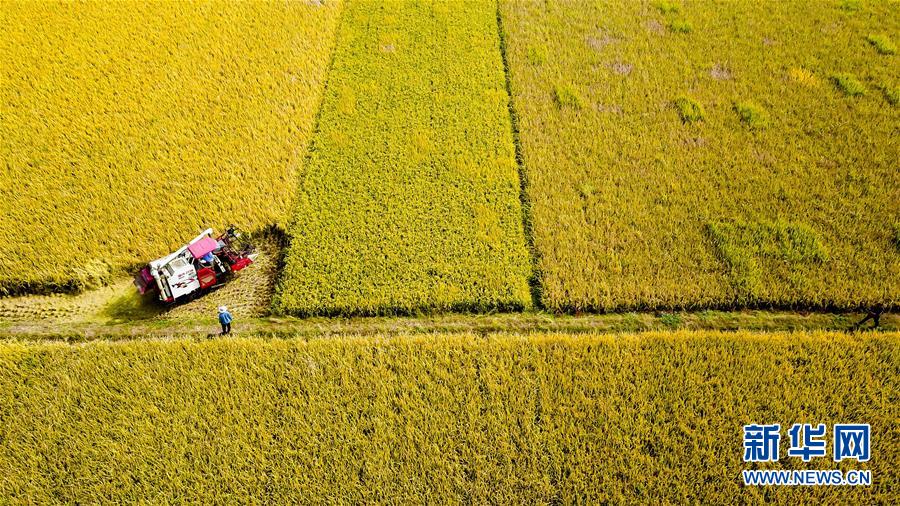 10月21日,在枣庄市台儿庄区邳庄镇,收割机在收获水稻(无人机照片)。 金秋时节,有着运河古城、江北水乡美誉的山东省枣庄市台儿庄区2万余亩水稻,进入成熟收获期,田野一片金黄,稻农开始忙碌收割水稻,呈现出美丽的田园风光。 新华社记者郭绪雷摄