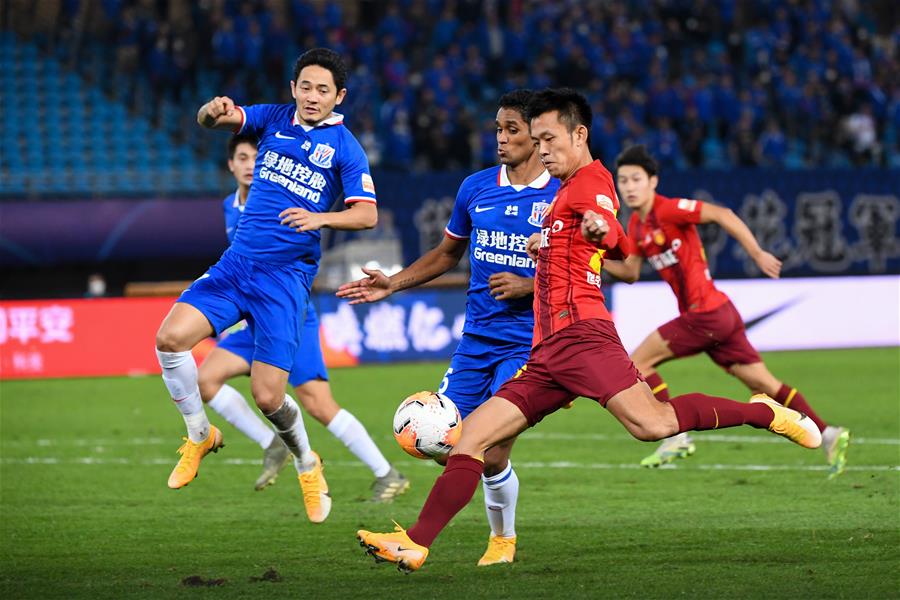 11月10日,河北华夏幸福队球员姜文骏(前)在比赛中射门。 当日,在2020赛季中国足球协会超级联赛(苏州赛区)第七、八名排位赛次回合比赛中,河北华夏幸福队以0比1不敌上海绿地申花队。最终,河北华夏幸福队以总比分1比5不敌上海绿地申花队,获得本赛季中超第八名。 新华社记者 李博 摄 |