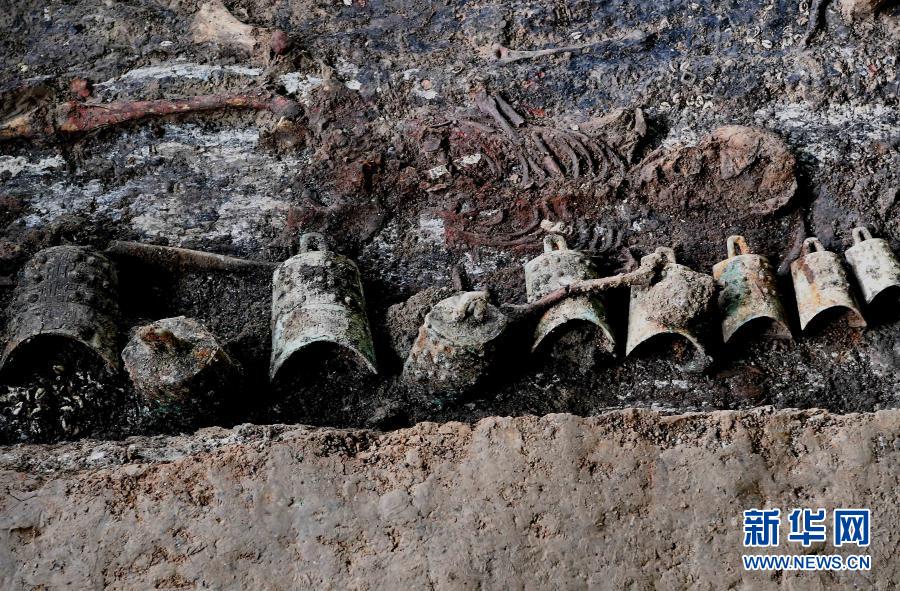 这是河南洛阳徐阳墓地标号为M15的墓葬出土的编钟(11月27日摄)。