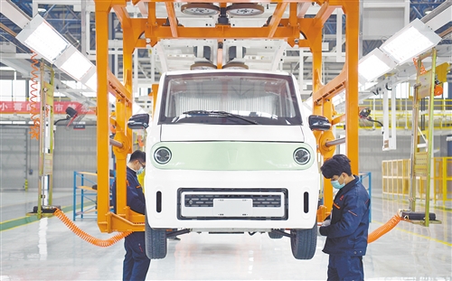 12月12日,工人在总装车间组装新能源快递车。当日,由山东豪驰智能汽车有限公司投资、中建电力建设有限公司承建的智能新能源商用车制造基地在山东济南市莱芜区投产。新华社记者 金良快摄