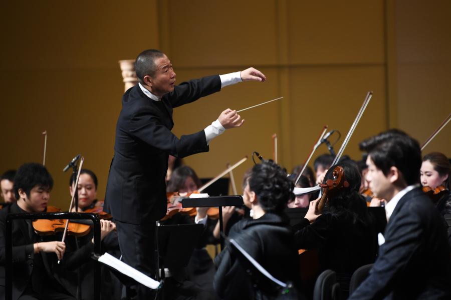 12月26日,指挥家谭盾在兰州音乐厅指挥《敦煌·慈悲颂》交响音乐会。