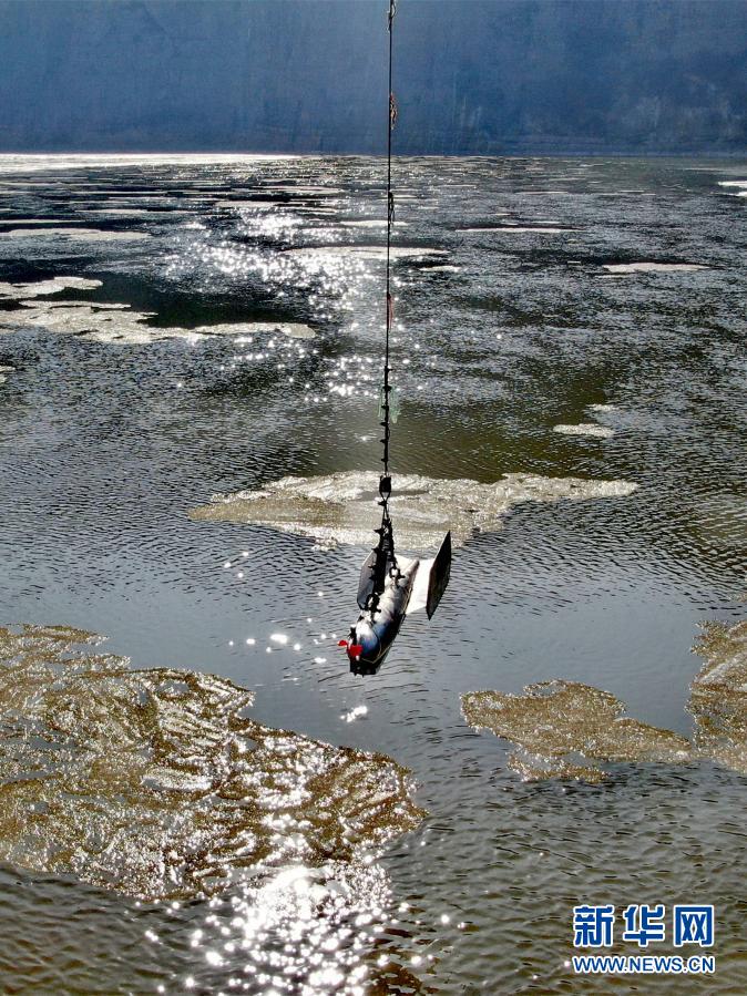 龙门水文站工作人员利用铅鱼缆道进行流量测验(12月27日摄,无人机照片)。新华社记者 刘诗平 摄